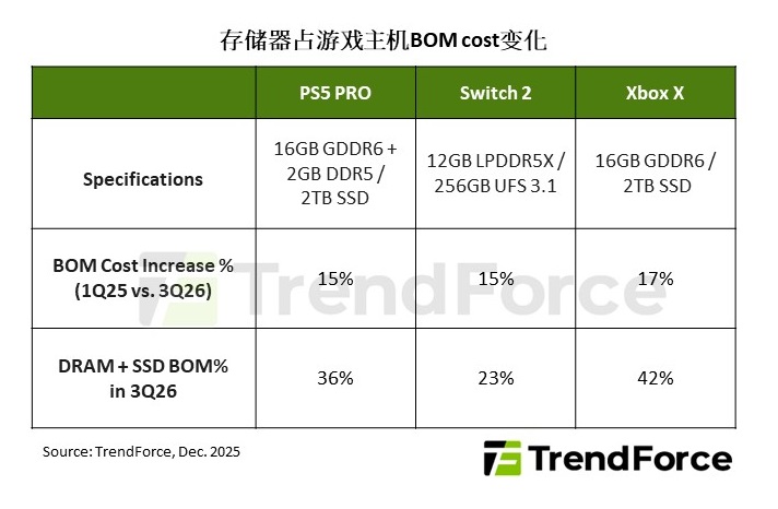 对于Sony(索尼)与Microsoft(微软)而言,2026年超过存储器成本占BOM cost超过35%的比例,这将导致主机上市数年后难以执行传统的降价策略,甚至在部分地区需调涨售价以转嫁成本,如Xbox便传将继2025年9月调涨价格后,再度涨价。在此背景下,厂商恐被迫打破以价求量的产业惯例,转而采取高售价确保获利的防御性定价策略。
